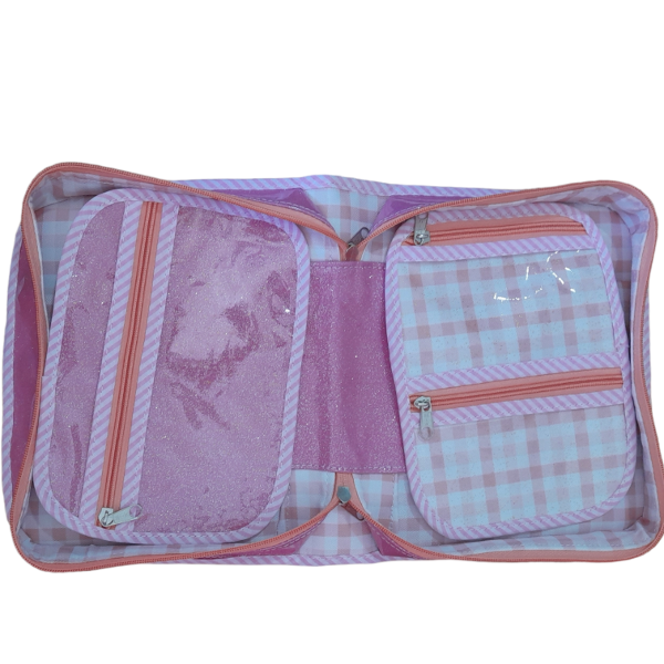 4 solapas con nylon, cierre para poner sacapuntas goma, regla lapiceras y más.. .